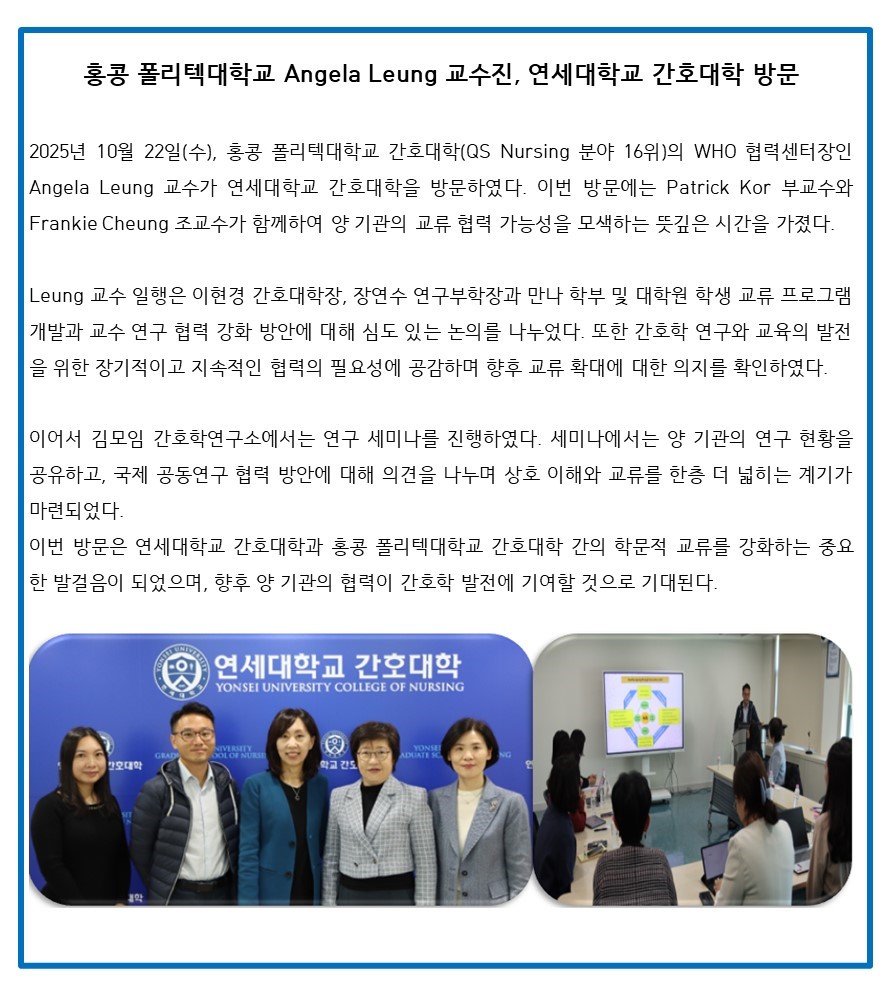 News 홍콩 폴리텍대학교 Angela Leung 교수진, 연세대학교 간호대학 방문 관리자 2025-10-23 조회수 229 공유하기 공유하기 페이스북 네이버블로그 카카오톡 카카오스토리 닫기 목록 이전글연세대학교 김모임간호학연구소, '2025 연세건강이음' 노인돌봄생활지원사 역량 강화 교육 성료 다음글2025년도 World's Top 2% Scientists 선정